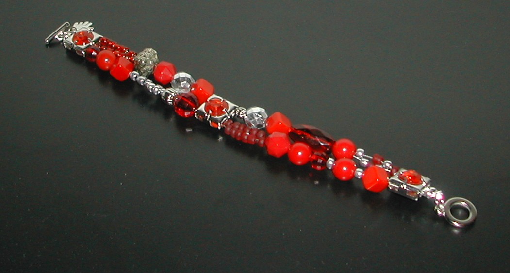 zilverkleurige metalen kraal verdelers waarin rode stenen zijn verwerkt.