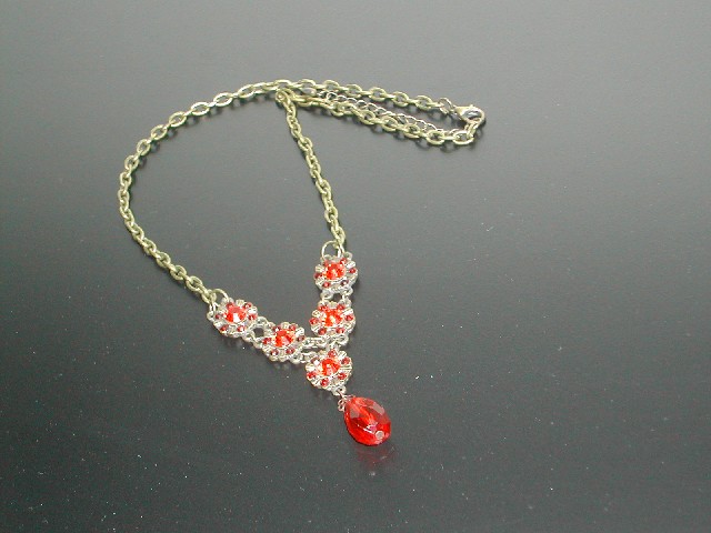 Materiaal : Koperkleurige schakelketting met 5 koperkleurige schakels met rode zirkonia steentjes en 1 grote rode druppel (glaskraal facet geslepen)