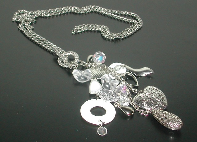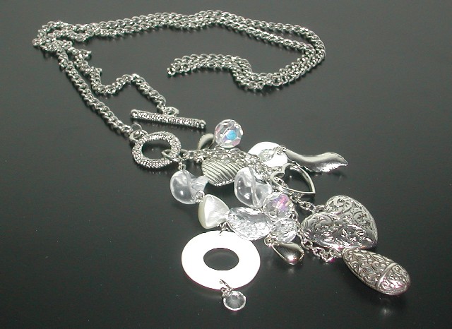 Materiaal : Lange zilverkleurige schakelketting met glazen en