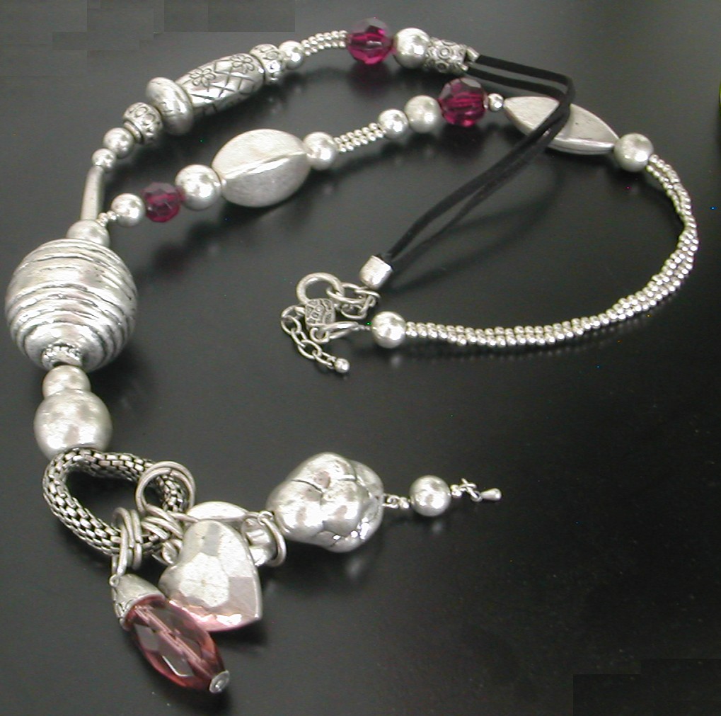 Materiaal : Grote paarse en metalen kralen geregen en als trosje verwerkt. Afgewerkt met een zwart suede veter.