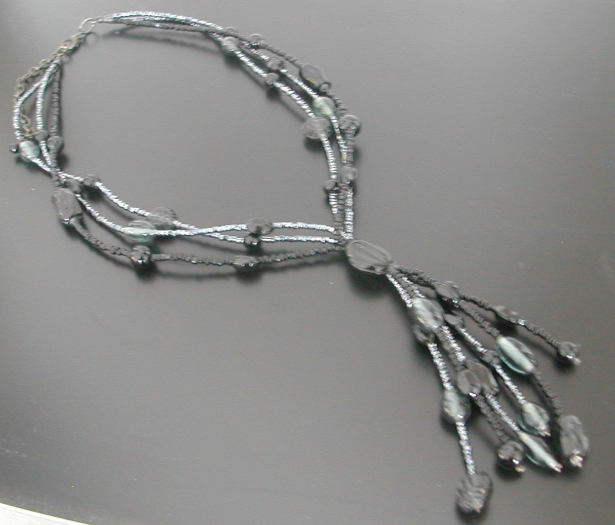 Materiaal : 3 Geplastificeerde metaaldraden geregen met diverse glaskralen. Het trosje is afgewerkt met kleine knijpkraaltjes.