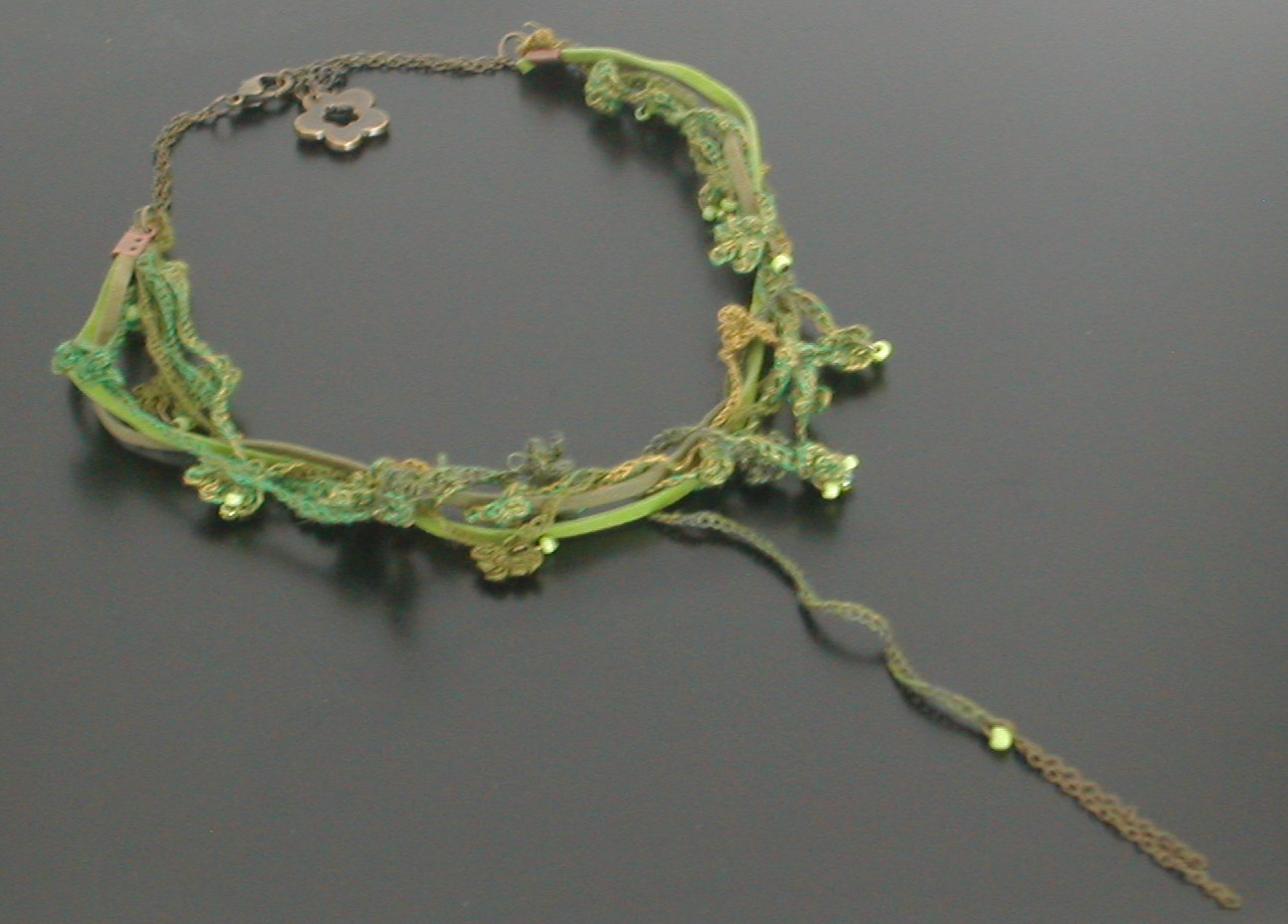 Materiaal : Gehaakte ketting met bloemetjes erin gehaakt. In de bloemetjes zitten glasparels verwerkt. Afgewerkt met 2 suède veters (zwart en grijs). Deze ketting is licht van gewicht en draagt dus prettig.