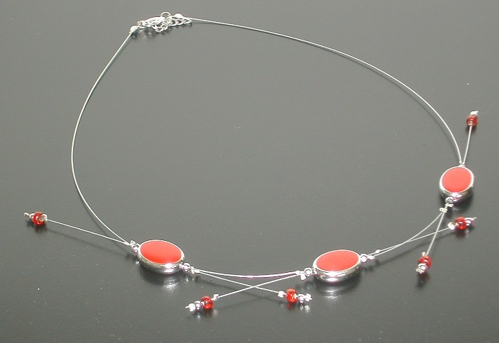 Materiaal : Rode metalen kralen zwevend vastgezet op geplastificeerd metaaldraad.