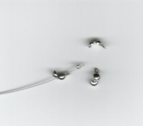 Werkwijze: Je schuift eerst het kalotje op het metaaldraad, met het haakje/oogje naar het uiteinde van de draad toe (zie voorbeeld foto hieronder). Daarna een knijpkraal. Knijp de knijpkraal vast op het metaaldraad en schuif nu het kalotje over de knijpkraal. Knijp het kalotje nu dicht over de knijpkraal. Nu heb je een uiteinde op het metaaldraad met een oogje. Waar je dus een slotje een ringetje of een kettelstift aan kan bevestigen.